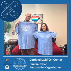 A local example of an initiative that promotes health literacy in Cortland includes the Cortland County Department of Health Community Immunization Ambassador program, of which The Cortland LGBTQ Center is a member. The Immunization Ambassador program is comprised of community members and organizations who volunteer their time to disseminate important health information in the community. Immunization Ambassadors provide outreach and education throughout the community to engage community members, provide five minute trainings on vaccines and how to talk with peers about vaccines, and assist community members with scheduling vaccine appointments, if needed.